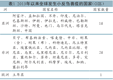 小反刍兽疫(PPR)自1942年首次在西非象牙海岸的科特迪瓦发现后,疫情一直呈扩散蔓延趋势,目前已扩散到亚、非地区的40多个国家,对全球养羊业形成巨大威胁。我国周边许多国家疫情呈大规模暴发或地方性流行,对我国动物卫生安全构成了严重威胁。2013年以来,全球共有26个非洲国家、16个亚洲国家以及地处欧亚交界的土耳其等43个国家报告发生小反刍兽疫(表1)。