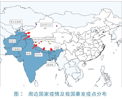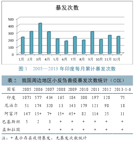 在我国周边,小反刍兽疫疫情流行十分严重,阿富汗、印度、孟加拉国、尼泊尔和巴基斯坦等国家的小反刍兽疫疫情常年呈地方性暴发流行,塔吉克斯坦、不丹疫情反复暴发。