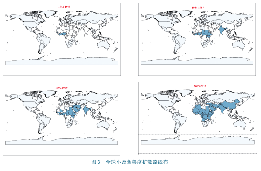 2.1PPR历史扩散情况。小反刍兽疫自在西非发现后,一直呈现向外扩散趋势。1942年科特迪瓦发现后,尼日利亚、塞内加尔、加纳等国家也相继发现PPR。1979年以前,小反刍兽疫主要发生于临近科特迪瓦的加纳、贝宁和尼日利亚等国家。期间在1962年,疫情跨过利比里亚、几内亚等多个国家长距离蔓延至塞内加尔。此后,PPR不断向东、南和北三个方向蔓延。1984年PPR扩散至苏丹,随后又蔓延至东非的肯尼亚、埃塞俄比亚和乌干达。1987年,小反刍兽疫扩散至印度北部地区。在1993—1995年期间,疫情蔓延至阿拉伯半岛、中东以及印度其他地区,包括伊朗、伊拉克、以色列、约旦、科威特、黎巴嫩、阿曼、沙特、阿联酋、也门、叙利亚等国家。1999年,小反刍兽疫蔓延到土耳其。2005年以前,小反刍兽疫疫情主要集中在撒哈拉沙漠以南和赤道以北的非洲国家以及阿拉伯半岛、近东、中东和南亚等地区。2006年,扩散至东非的肯尼亚,2007年扩散至中国的西藏,2008年扩散撒哈拉沙漠以北的摩洛哥、突尼斯以及赤道以南的坦桑尼亚,2010年继续向南扩散至赞比亚,向东扩散至不丹;2011年继续向北扩散至阿尔及利亚。至今,小反刍兽疫向北已跨过撒哈拉沙漠扩散至北非,向南已越过赤道扩散至赞比亚、安哥拉,向东早已越过非洲扩散至阿拉伯半岛、南亚、西亚、中亚以及土耳其和中国(图3)。