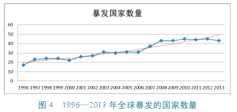 2.2PPR扩散趋势分析。从小反刍兽疫的历史扩散态势分析,小反刍兽疫一直在不断扩散。在10多年的时间内,从1996年的17个国家已增加至现在的40多个国家,整体呈现不断上升的趋势(图4),发病国家几乎遍及整个非洲、中东、西亚和南亚地区,现在又不断向中亚、东亚地区蔓延。未来一段时间,小反刍兽疫将继续呈现全球蔓延的趋势,但非洲和亚洲部分国家仍将是疫情重灾国。