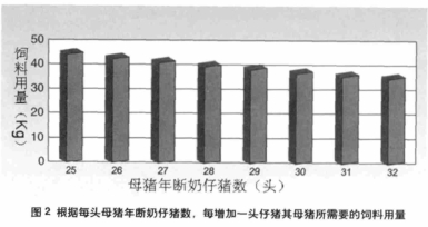 荷兰托佩克国际种猪公司(TO PIG S)的母猪的生产性能在逐年改善,见图 1 所示。2011 年,在荷兰 678 家养殖场的生产记录中,超过 164 家成功地实现每头母猪年断奶仔猪数达到 30 头以上。显然,这对每增加饲养一头仔猪其母猪所需要的饲料总量会产生较大的影响。举例来说,繁育猪群所使用的饲料总量平均每头母猪每年需要 1. 15 吨。图 2 显示了根据每头母猪年断奶仔猪数,每增加一头仔猪其母猪所需要的饲料用量。有图可见,我们的重点应该关注在饲料效率上(即每吨饲料的生猪产量) ,而不是饲料转化率(即每头猪的平均饲料重量或猪肉生产的重量) 。不过,我们需要更进一步做的是,采用总饲料效率(TFE)来包含仔猪生产和育肥猪生产。