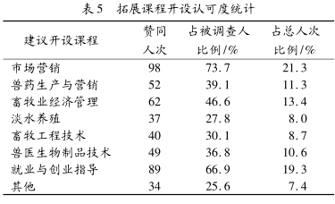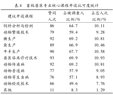 采用问卷调查方法进行。结果为:认为应当开设动物解剖生理的有 34 人次, 生物统计的 19 人次, 动物营养与饲料的有 57 人次, 动物微生物 23 人次, 动物病理 62 人次, 动物药理37 人次, 动物遗传育种 29 人次, 其余 10 人次。结果表明, 实用度较高的课程认同度较高, 而生物统计、 动物微生物、 动物遗传育种等行业使用度较低的课程整体认可度不高, 在一定程度上反映了本行业对专业人才实用性的用人需求。