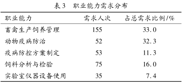 结果表明, 本行业对毕业生的核心专业能力有一定高的要求。而且在一些特殊岗位对一些专业能力要求有明显的行业特征, 如畜禽门诊、 宠物医院及企业实验室检验岗位对实验室仪器操作及门诊病例处置能力的要求很高。