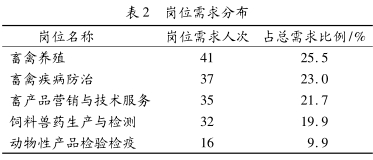调查涉及主要就业单位包括:畜禽养殖场、 畜禽繁育中心、 饲料与兽药生产经营企业、 畜牧兽医站、 动物卫生监督所、 动物医院等企事业单位, 总共调查 161 人次, 结果见表 2。结果表明:畜牧兽医专业毕业生的岗位需求主要集中在畜禽养殖、 畜禽疾病防治、 饲料兽药生产与检测以及畜产品营销与技术服务等岗位。