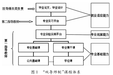 2009 年, 国家相关政策出台, 硕士培养单位纷纷引入了 “双导师制” 。有调查显示, 有 64% 的校内指导教师、 76%的校外指导教师、 81% 的全日制专业硕士肯定了 “双导师制” 的培养效果。高校师生与管理人员普遍认为它适应了专业硕士作为应用型人才的培养需要。学院从 2010 年开始, 从学科内部养殖领域中选拔专业理论水平较高、 现场工作经验较丰富、 教学指导能力较强的具有副高级技术职称的教师担任校内第一指导教师。同时, 吸收哈尔滨大北农牧业科技有限公司、 哈尔滨市联丰饲料有限公司等畜牧养殖单位、 饲料企业具有副高级职称的专家或其他具有较强责任心、 工作经验非常丰富的相关专家或人员, 担任全日制专业学位研究生校外第二指导教师, 初步建立起了 “双导师制” 教学体系, 见图 1。