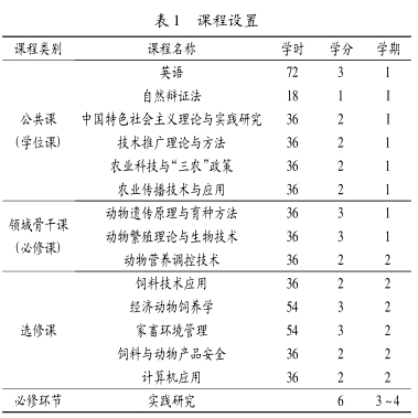 全日制专业学位教育的课程设计主要以生产需求为导向, 以有利于未来人才和行业发展为目标;因此, 本专业全日制专业学位教育的课程设计也以生产需求为导向, 以有利于未来人才和行业发展为目标,并根据学院师资力量及专业特色进行了有机的结合。学院根据全国养殖领域协作组下发的指导性培养方案, 结合学院学科优势与专业特色, 在调查了解社会经济发展、 生产单位实际以及企业发展需求的基础上, 重新制订了养殖领域全日制专业学位研究生的培养方案, 开设的领域主干课程都是学院在多年研究生教学中积累了丰富经验和实践教学案例的课程。见表 1。