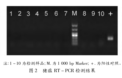 提取样品中 RNA, 反转录后通过套式 RT - PCR检测样品中是否含有猪瘟病原, 其目标条带为270 bp, M 为 1 000 bp 的标准 Marker, + 为阳性对照,结果见图 2。由图 2 可知, 样品中没有猪瘟病毒, 证明此次检测的 10 头母猪不存在猪瘟病毒感染。