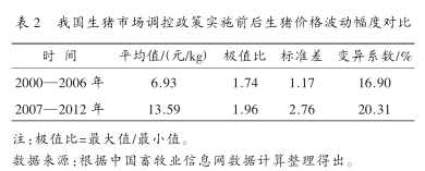 当前国家主要将猪粮比价作为调控生猪价格的决策依据。2012 年 5 月发布的 《缓解生猪市场价格周期性波动调控预案》 规定, 当猪粮比价位于 6∶1~8.5∶1 时, 生猪价格正常。2000—2006 年, 我国猪粮比价的平均值仅为 5.82∶1,还没有达到盈亏平衡点(6∶1) 其中月度猪粮比价的最低值为 4.37∶1, 最高值为 7∶1, 猪粮比价低于 6∶1 的月份有 47 个, 占样本数据的 56%左右。2007—2012 年, 猪粮比价平均值为 6.95∶1, 最低值 4.61∶1, 最高值达到 9.64∶1, 有 20个月份的猪粮比价低于 6∶1, 9 个月份的猪粮比价超过 8.5∶1,分别占样本数据的 27.78%和 12.5% (图 1) 。也就是说,猪粮比价位于正常区间的月份占比达到59.72%,高于政策实施前的 44.05%。这表明政策的实施一定程度上保持了合理的生猪价格水平,但并未能有效遏制生猪市场价格大起大落的势头。月度生猪价格的极值比、标准差和变异系数 3 个表明生猪价格波动幅度的指标都较政策实施前增加(表 2) 。