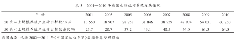 2007 年以前,我国生猪饲养一直以散养为主。散养户频繁的进退市场行为使得我国生猪生产经常处于波动之中。受此影响, 生猪价格频繁波动。2007年开始,国家出台了生猪标准化规模养殖补助等政策来推动我国生猪规模化养殖进程。从政策运行的结果来看,现阶段我国生猪市场调控政策对于推进生猪规模化养殖的效果是比较理想的。2007 年 50头以上规模养殖户提供的生猪占全国生猪总量的比重达到 48.5%, 2008 年、 2009 年生猪规模养殖比例相继超过了 50%和 60%, 2010 年接近 65% (表 3) 。并且中等规模和大规模养殖户数量不断增加,其生猪出栏占比逐年提高。2006 年年出栏 500 头以上规模养殖户提供的生猪数量占全国生猪总量的比例为16%,年出栏 1 万头以上生猪养殖户提供生猪占比为 3%。 到了 2011 年, 年出栏 500 头以上的规模养殖户生猪出栏占比上升至 36%, 年出栏 1 万头以上的比重达到 7.5%, 分别较 2006 年增加了 20%和 4.5%[1]。生猪规模养殖比例快速提高的原因主要有两点: 一是优胜劣汰的市场规律所致,二是国家鼓励扶持政策的推动。