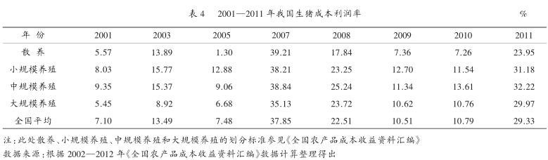 2001—2006 年,全国生猪平均成本利润率为11.44% (成本利润率等于净利润除以总成本) , 其中散养生猪、 小规模养殖、 中规模养殖和大规模养殖的成 本 利 润 率 分 别 为 9.66% 、 14.27% 、 12.95% 和8.85%。2007—2011 年全国生猪平均成本利润率上升至 22.2%, 较前一阶段增长了近 1 倍。 其中大规模生猪成本利润率增幅高达 149.04%,散养生猪成本利润率、中规模生猪成本利润率的增幅也都超过了80%。 并且, 生猪成本利润率的最大值和最小值也相应增加。在 2001—2006 年间, 全国生猪平均成本利润率最高的年份为 2004 年, 其值为 19.79%; 最低的年份是 2001 年, 其值为 7.1%。2007—2011 年间, 成本利润率最高的年份是 2007 年, 其值高达 37.85%,最低的年份是 2009 年,成本利润率为 10.51% (表4) 。这说明,我国生猪市场调控政策对于增加生猪养殖户收入发挥了积极作用。但政策的实施并没有很好地解决养殖户收入稳定性的问题,我国年度生猪成本利润率差别较大。