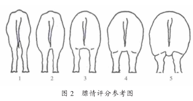 主要在约 160 日龄及初配时测定。 具体要求为:160 日龄时的背膘通过膘情评分图 (图 2) 进行评分,分值在 3~3.5 分, 初配时的 P2 背膘 18~22 mm。