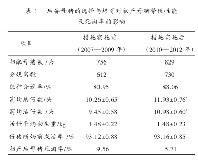 通过比较实施后备母猪选择与培育措施前后各3年深农配套系父母代后备母猪的初产性能与死淘率等指标发现,经过后备母猪选择与培育方案培育的母猪其初产性能显著提高、初产母猪的死淘率明显下降。
