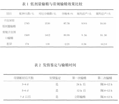 子宫深部低剂量输精技术中采用特制输精管将精子直接输送到子宫腔内,减少了精子损失,增加了活精子与卵子结合的机会,保持了最佳受精能力,从而在较低精子浓度下就能达到与常规授精相当的受精效果,每次用 5 亿 ~8 亿有效精子低剂量授精时可获得89% 的产仔率。
