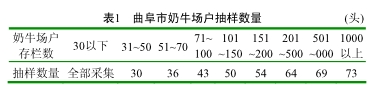 3.1.1 材料和方法 (1)试验材料:结核菌素(哈药集团生物疫苗有限公司生产,批准文号兽药生字(2012)201008)、游标卡尺(精度为0.02mm)、毛剪、酒精棉、1ml注射器、工作服、一次性帽子、一次性口罩、胶靴、记录表等。(2)检测的牛群:曲阜市所有奶牛场户100%进行抽样,根据场户的规模大小计算抽样数量。具体抽样数量见表