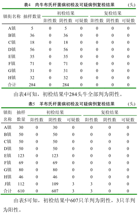 (3)血清检测:对采集的1379份牛羊血清首先使用布氏杆菌病虎红平板凝集试验初步检测,凡初检结果为疑似或阳性的,再使用试管凝集试验进行复检。