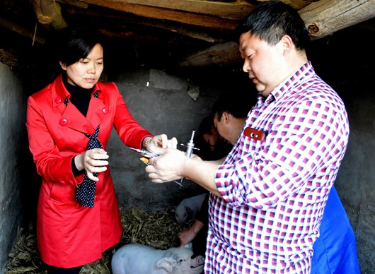 9:10,县督导组成员美女小李也跃跃欲试,想体验一把生猪免疫注射工作,独立完成疫苗的稀释工作后,将疫苗吸入针管,来到生猪栏内,虽有男同胞保驾护航,可她的双手还是不停地打哆嗦,组长周良政给其打气,中心主任黄明军也为其助阵,小李顺利完成第一针注射任务;可在第二种疫苗注射时,针头落下,可生猪一哄跑散,针管的药水却漏了出来。农户以为她是村防疫员带的徒弟,再也不让小李动手了,组长周良政接过注射器完成了剩下的注射器任务。