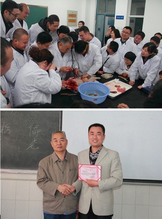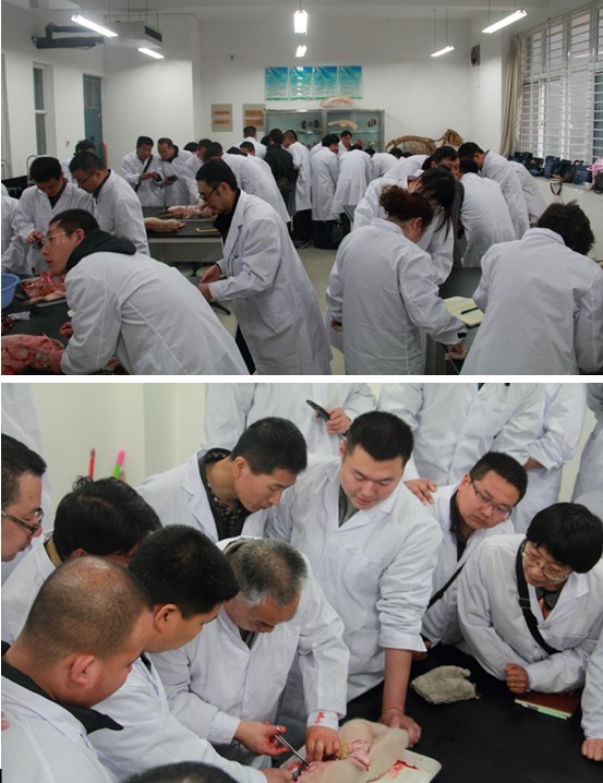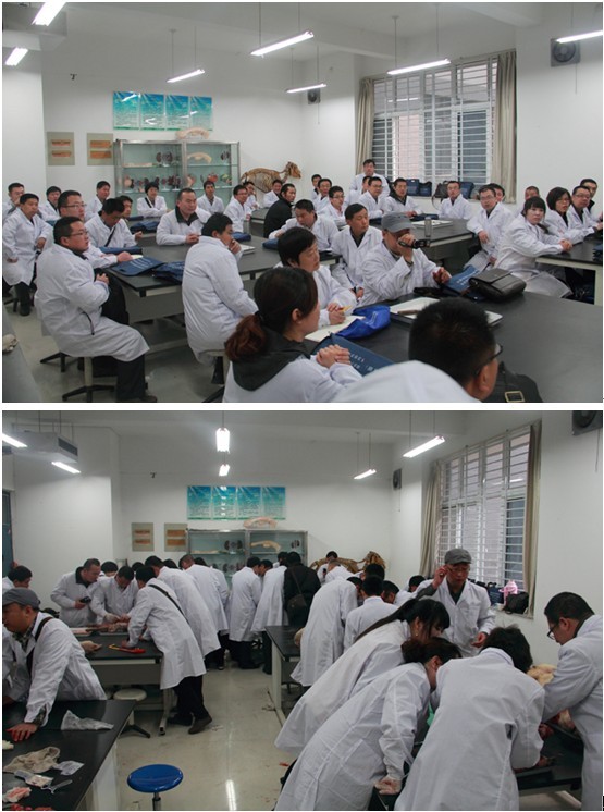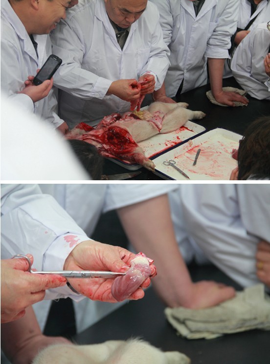 培训班的课堂上,芦惟本老师针对当前猪病的流行情况,深入浅出地分析了猪病的发生、流行趋势,介绍了影响养猪生产的主要疫病的最新防控技术,并对各种疫病的病理剖检作了详细讲解和实践操作。