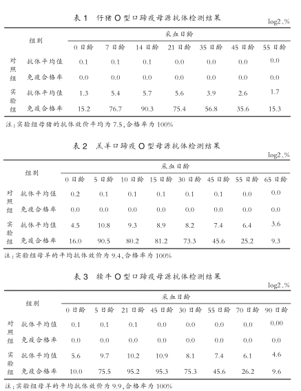 3.2仔猪在 35 日龄母源抗体效价降到不合格水平,羔羊在 45 日龄抗体效价降到不合格水平,犊牛在 55 日龄抗体效价降到不合格水平, 起不到有效的保护作用。 仔猪在 35 日龄,羔羊 45日龄左右、犊牛 55 日龄左右进行首免较为适宜, 这样可减少母源抗体的干扰, 有利于幼畜口蹄疫免疫抗体水平的迅速提高,起到较好的免疫效果。