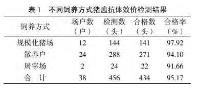 检测结果见表 1, 抽检规模化猪场、 散养户和屠宰场猪瘟抗体效价合格率分别为 97.92 %、94.10%和 91.66 %平均合格率达到 95.17%。规模化猪场猪瘟抗体效价合格率高于散养户和屠宰场合格率。