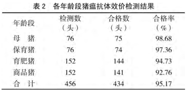 检测结果见表 2。 母猪、 保育猪、 育肥猪和商品猪的猪瘟免疫抗体合格率分别为98.68% 、97.36% 、 94.73% 和 92.76% 。 其中母猪合格率最高达到 98.68%。