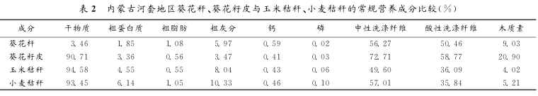 1.3 葵花杆、 葵花籽皮营养成分分析 葵花秆、葵花籽皮中粗脂肪含量分别为1.08%和0. 56%; 粗蛋白质含量分别为1.85%和3.36%, 其低于玉米秸秆和小麦秸秆中粗蛋白质含量; 而粗纤维含量尤其是木质 素 含量 高于 玉 米秸秆和 小 麦 秸 秆 ( 赵 媛,2011) 。由此可知, 葵花秆和葵花籽皮营养价值低,消化性差, 粉碎处理后不适宜在养殖中大量使用, 但可通过微生物发酵处理提高其营养价值。内蒙古河套地区葵花秆、 葵花籽皮与玉米秸秆、 小麦秸秆常规营养成分比较见表2。