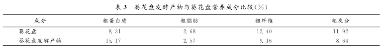 2.4 制作复合生物蛋白饲料 龚仁( 2009) 利用微生物多菌种固体发酵葵花盘生产生物蛋白饲料,将产朊假丝酵母、 米曲霉、 枯草芽孢杆菌、 黑曲霉按l∶1∶2∶1比例接种, 按1.5%接种量加入到固体发酵培养基, 发酵48h, 生产的生物蛋白饲料中粗蛋白质含量显著增加, 粗纤维和粗灰分含量均有降低( 表3) , 明显改善了原料的营养结构和适口性, 发酵产物具有酸甜味和酒香味。李茂毅等( 2010) 用产朊假丝酵母、 米曲霉和康氏木霉组成的复合微生物菌剂发酵葵花盘生产生物蛋白饲料也取得了相似结果。采用复合微生物菌剂发酵处理葵花盘工艺简单、 处理量大。所生产的产品营养价值高、 适口性好, 能为动物肠道提供有益菌群, 改善胃肠内环境,同时也可解决废弃葵花盘污染环境及资源浪费等问题, 值得在地区研究推广。