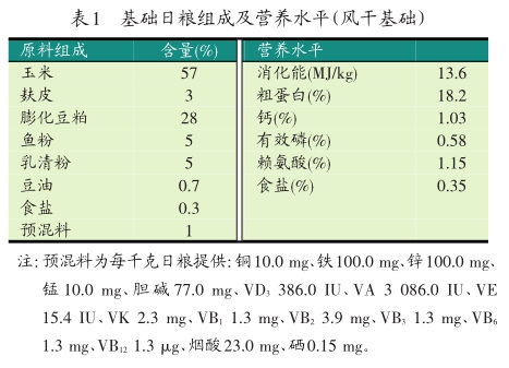 选取分娩日期相同、 初生重相近、 体质健康的杜洛克×长白×约克夏三元杂交28 d断奶仔猪80头。基础日粮组成及营养水平见表1。