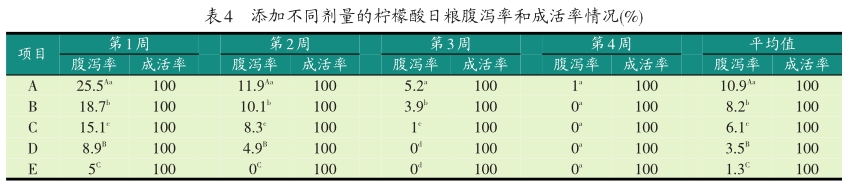 表4结果表明, 不同的柠檬酸添加量对仔猪腹泻有一定影响。日粮中添加柠檬酸可降低胃内pH值,减少仔猪腹泻的发生[6]。前2周添加柠檬酸可降低腹泻率, 即添加量与腹泻率呈负相关, 其中D组、 E组与A组相比极显著降低腹泻率(P<0.01)。随着周龄的增加, 仔猪生长发育逐步健全, 从第4周开始腹泻发生率与柠檬酸添加剂量不存在对应关系。