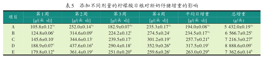 表 5 结果表明, 每周均为 D 组仔猪个体增重最多, 平均日增重 B、 C、 D、 E 组分别比 A 组提高 40.5、63.7、 123.5、 69.0 g, C、 D、 E组与A 组相比差异极显著(P<0.01) , 但A、 B两组间的差异不显著(P>0.05)。总增重B、 C、 D、 E组均高于A组。