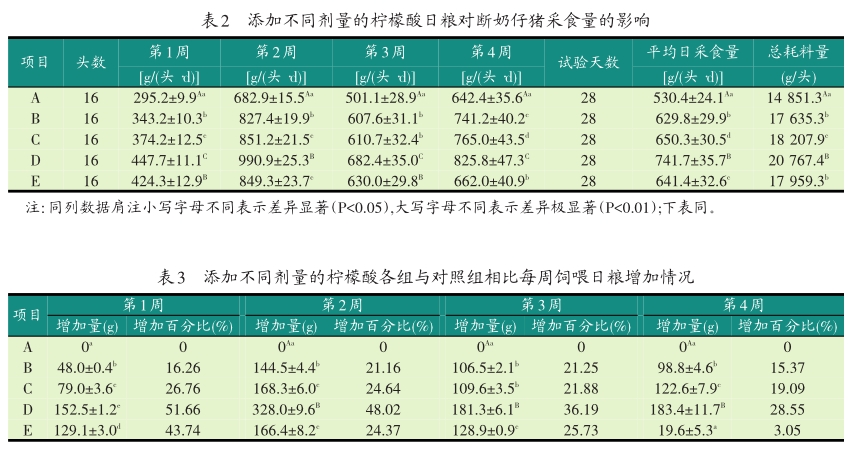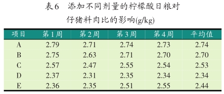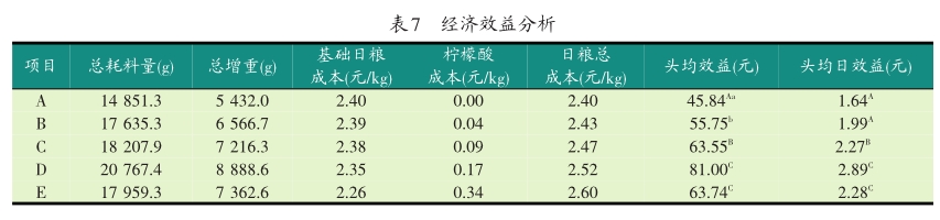 添加适量柠檬酸能够提高经济收益, 其中与对照组相比, 日粮中添加2%柠檬酸, 对仔猪的采食量、 饲料转化率、 个体增重效果最好, 每日每头能够增加经济效益1.25元, 效果最佳, 对养殖户而言是饲养添加最优方法。