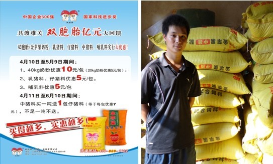 双胞胎集团适时推出的“共渡难关,亿元大回馈”活动,让广西壮族自治区蒙山县规模猪场养户莫升隆最为受惠,他的猪场目前有一部分生猪进入仔猪料饲喂阶段,还有相当部分生猪进入育肥阶段,育肥猪正是使用中猪料的时候。3月提中猪料144.08吨,双胞胎亿元回馈养户,每吨中猪料送1包仔猪料,等于每包中猪料减少了6-7元钱,光中猪料一项,就相当于节省了2万3千多元。送的仔猪料正好解决了一部分生猪的用料问题。据了解,2013年,也是猪价低迷,养户准备放弃养猪的时候,双胞胎让利几个亿,连续三个月实施降价、促销、优惠三管齐下,让养猪户坚持了下来,抗到了下半年猪价回升,赚到了钱。莫升隆说,养猪跟着双胞胎就是好,双胞胎不仅是好猪料,而且双胞胎总是在养户最困难的时候雪中送炭!