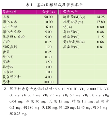 随着养猪生产集约化程度的不断提高, 仔猪早期断奶变得越来越重要。但早期断乳易造成仔猪肠道功能紊乱, 仔猪肠道绒毛高度下降, 隐窝深度加深, 从而使仔猪消化道消化吸收的面积减少, 进而影响仔猪生长性能 (徐春兰等, 2004) , 诱发 “仔猪断奶应激综合症” (郑秋锋, 2002) 。而发酵饲料是以饲料为基础物质, 添加有益微生物使其大量繁殖, 先进行体外消化, 分解饲料中的抗营养物质, 当动物采食后, 营养物质得到充分吸收, 有益微生物又可定植在肠道中, 从而改善仔猪的肠道结构, 弥补了早期断奶带来的缺点。