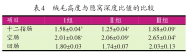从表 4 可以看出, 对于十二指肠的 V/C 值, 各组间差异显著(P<0.05); 对于空肠的 V/C 值, Ⅲ组比Ⅰ组、 Ⅱ组分别提高了 31.84%、 28.64%, 差异显 著(P<0.05); 回肠的 V/C 值各组间差异不显著(P>0.05)。