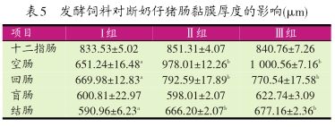 2.4发酵饲料对早期断奶仔猪肠道黏膜厚度的影响(见表5)