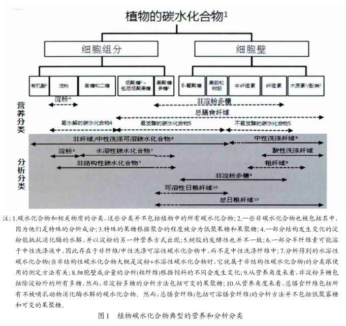 至今为止,“纤维” 也许是猪饲粮中最知之甚少的组分, 通常它被描述为植物性原料中一种复杂而又充满不确定性的成分(NRC, 2007)(见图1)。值得注意的是, “纤维” 的分析方法要么使纤维组分发生重叠, 要么包括其他方法没法检测到的组分; 因此, 我们对纤维利用率的分析测定一直是个问题。某些种类的纤维比其它种类的纤维更易消化, 尽管纤维不能被哺乳动物的酶降解, 但可以在后肠道被细菌发酵利用(Grieshop等, 2001)。这些纤维通常被称为 “非淀粉多糖” (NSP), 植物细胞壁的90%部分是由非淀粉多糖构成的, 这其中的纤维素、 半纤维素和果胶的含量最为丰富(Selvendran等, 1990)。而果聚糖、 葡甘露聚糖、 半乳甘露聚糖、 胶质、 β-葡聚糖和树胶所含的非淀粉多糖较少。研究发现, 植物中的纤维素呈紧密地结合在一起的聚合物, 而半纤维素和果胶则存在易被降解的糖支链上。木质素不是一种多糖, 是一种高分子聚合物, 由于它不能被猪消化, 所以不被认为是一种功能性膳食纤维(Grieshop等, 2001)。正如图1所示, 通常用来确定高纤维原料和饲料中复杂碳水化合物的分析方法有: 测定粗纤维、 酸性洗涤纤维(ADF)、 中性洗涤纤维(NDF)、 总膳食纤维(TDF)的可溶性和不溶性组分以及非淀粉多糖(NSP)。由于每一种纤维分析方法测定的是复杂碳水化合物中的几种, 有时是几个不同的组分, 这就使得我们无法充分确定猪饲料的能值。