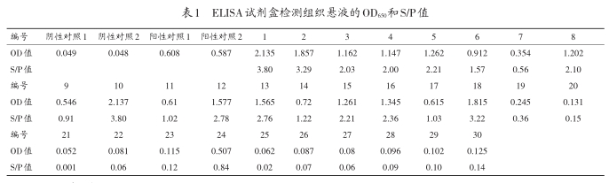 用处理好的研磨器研磨组织, 离心后收集上清作为检测原。取 96 孔板恢复至室温, 其中第1~2孔为阴性对照, 第3~4孔为阳性对照, 在剩余检测孔加入组织悬液100 μL, 室温作用1 h; 用超纯水洗涤后加入酶标抗体 100 μL, 室温作用1h; 用超纯水洗涤后加入TMB显色液100 μL, 避光显色15 min后, 加入终止液100 μL, 读取OD650值。通过计算S/P值来判断结果。