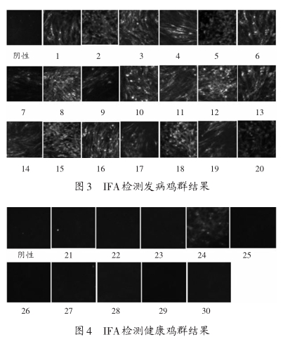 2.1.3 IFA荧光显微镜下观察发现, 20份发病鸡群样本所感染的细胞均有特异性绿色荧光, 均为阳性(见图3) ; 10份健康鸡群样本所感染的细胞中只有 1 份 (24 号) 有特异性绿色荧光, 其余为阴性(见图4) 。