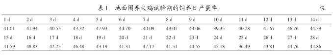 试验期间火鸡的日产蛋率见表1。由表1可以看出, 试验期间火鸡的饲养日产蛋率最高为49.07%, 最低为36.49%, 经计算平均饲养日产蛋率为43.24%。其中, 除第25天的饲养日产蛋率只有36.49%外, 其它饲养日产蛋率基本都在40%~49%范围内, 这在群体数量只有217只、 生理状况处于产蛋后期的情况下, 试验火鸡的产蛋率较为稳定。