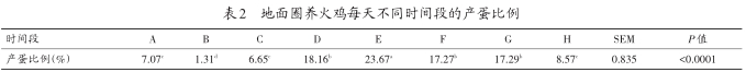 由表2可以看出, 11 ∶31~13 ∶30产蛋比例最高, 为23.67%, 显著或极显著高于其它时间的产蛋比例 (P<0.05 或 P<0.01) ; 9 ∶31~11 ∶30、 13 ∶31~15 ∶30和15 ∶31~17 ∶30产蛋比例分别为18.16%、17.27%和17.29%, 显著低于11 ∶ 31~13 ∶ 30 ( P<0.05 ) ,显著或极显著高于其它时间段的产蛋比例(P<0.05或P<0.01) ; 而5 ∶ 31~7 ∶ 30产蛋比例最低,为1.31%, 显著或极显著低于其它时间段的产蛋比例 ( P<0.05或P<0.01 ) ; 19 ∶ 01~次日5 ∶ 30、 7 ∶ 31~9 ∶ 30、17∶31~19∶00产蛋比例分别为7.07%、 6.65%和8.57%, 显著高于 5 ∶31~7 ∶30 (P<0.05) , 显著或极显著低于其它时间段的产蛋比例 (P<0.05 或P<0.01) 。可见, 每天不同时间段火鸡的产蛋分布明显不同, 其中11 ∶31~13 ∶30产蛋比例最高,5 ∶ 31~7 ∶ 30产蛋比例最低, 产蛋主要集中在9 ∶ 31~17 ∶ 30。