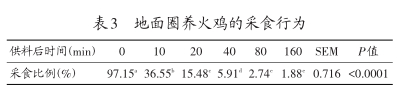 火鸡采食行为的统计结果见表3。由表3可以看出, 喂料当时 (0 min) 采食比例显著或极显著高于其它时间的采食比例 (P<0.05或P<0.01) ; 10 min采食比例极显著低于喂料当时 (P<0.01) , 显著或极显著高于其它时间 (P<0.05或P<0.01) ; 20 min采食比例与0、 10 min类似, 显著或极显著高于除0、 10 min外的其它时间 (P<0.05或P<0.01) ; 40 min采食比例显著高于80、 160 min(P<0.05) 。可见, 给火鸡喂料后, 80 min内随采食时间延长, 采食比例会很明显地逐步降低, 但从80 min后开始变化不明显。