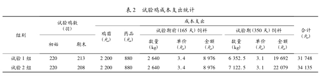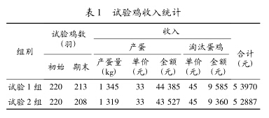 试验1组成活率为96.8%,料蛋比4.7∶1,平均每只鸡可获利润101元。试验2组成活率为94.5%,料蛋比5.4∶1,平均每只鸡可获利润85元,见表1、表2。