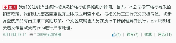 光明乳业昨天在其官微发表声明表示,“本公司没有强行摊派的销售政策”,并称公司对此事已成立调查小组。初步调查显示,该产品有员工推广奖励政策,个别区域销售人员在执行中错误理解并执行。
