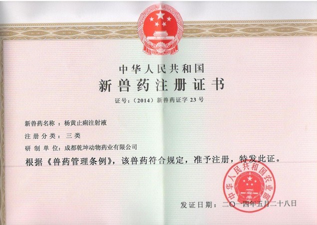 近日,成都乾坤动物药业有限公司收到农业部办法的新兽药注册证书,公司自主研发纯中药制剂“杨黄止痢注射液”获得国家三类新兽药注册证书,证号为(2014)新兽药证字23号。