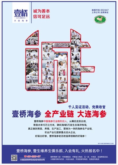 近日,壹桥海参全产业链大连海参千人见证活动完美收官。此次见证活动,大家亲身感受到了什么是真正的全产业链海参企业,并郑重为壹桥的每一根大连海参做出见证。
