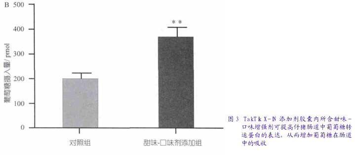 已经上市的一种饲料添加剂叫TakTikX-IN,它专门为优化仔猪肠道健康和发育而设计。这种添加剂是由瑞士Panscoma公司(饲料原料供应商)与EeboSpraytec公司(产品生产商)合作生产的第一个产品。两大公司联手,在瑞士发布了首个发牙床粒化技术和包被设备。这种添加剂是一种包被型植物提取物和口味增强剂,其功能不仅能够提高动物的饲料采食量,而且可增加肠道的葡萄糖吸收量(图3)。它是专门用于应对与仔猪断奶有关的挑战的:风味增强剂可提高采食量,生物活性甜味剂可增加葡萄糖的吸收。每个胶囊都涂布了一层茴香脑(大茴香和茴香中的一种植物性营养物)和冬青油,可以产生清新的香味,以促进动物采食。这种添加剂中的茴香脑也具有提高肠道健康的潜能,因为多项实验结果表明这种物质可减少炎症和自由基的形成,鸡采食含茴香脑的饲料后,可降低球虫病的严重程度,增加免疫力。这种物质对于仔猪肠胃健康的影响研究正在进行中。每个胶囊的内核中含有特殊剂型的甜味-口味增强剂,可提高动物的采食量,还可以增加肠道对葡萄糖的吸收作用。