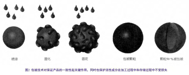 当营养物质的吸收和免疫力受到损害时,动物的生长也会变得不理想,这具有明确的经济学意义,因为仔猪断奶时的体重与出栏时的体重高度相关。重要的是,当动物在刚断奶时的生长性能表现很差时,在随后的生长中增重似乎不存在补偿的现象。因此,许多养猪生产者从仔猪断奶后的第一天起就将重点放在可以提高其采食量和日增重的策略上,以优化仔猪终生的生产性能和经济回报。虽然市场上有几种可以用于对抗断奶后应激的产品,但它们中很少能够促进肠道的正常生理与发育。另外,添加剂的生产方式对该产品在生产上的使用效果会产生显著影响。多年来,含有香味、口感增强剂和甜味剂以及生物活性植物提取物的饲料添加剂,已广泛用于仔猪料中,以增加其采食量和日增重。虽然,包含在这些产品中的许多活性成分显示出可增加饲料的香味和提高动物的采食量,但关键是这些活性成分需要进行包被,以保证产品性能的一致性,最大限度地减少各批产品间活性成分含量上的差异,同时也可确保活性成分在加工和储存期间不受降解。包被可以保护活性成分免受不断变化的环境影响,也可以用于控制添加剂在特定消化阶段的释放。图2显示了利用包衣进行包被的过程,研究显示这一过程可确保颗粒大小一致,保护活性成分在加工过程中不受损失,也可减小各批产品间在活性成分含量上的差异。