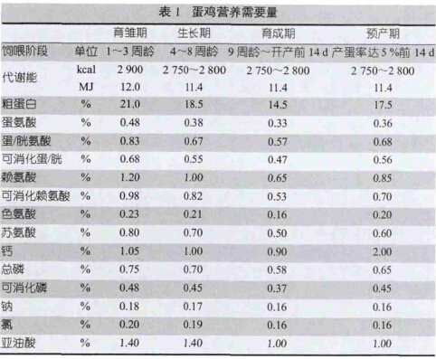 表1中蛋鸡不同生长阶段日粮的营养推荐值基于实际经验。体重的检测在7~8周龄进行。通过选择一个有代表性的准确时间点来更换日粮。雏鸡日粮更换为生长期日粮应该在平均体重达到700g时进行。因此换料的正确时间不是由日龄来决定,而是由体重来决定。
