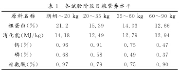 试验预试期50d(仔猪培育阶段,断奶~20kg体重阶段),正试期120d。正试期分为3个阶段:前期30d,20~35kg体重阶段;中期40d,35~60kg体重阶段;后期50d,60~90kg体重阶段。育肥猪120d时饲喂试验结束,全部称重出栏。各试验阶段日粮配方及营养水平见表1。