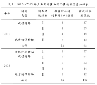于2012~2013年的7~10月份,对上海郊区规模猪场、地方猪种保种场和市级种公猪站的种公猪开展抽样监测,同时对种公猪的精液生产情况进行详细调查,包括采精时间、采精频率、采精量以及舍内温度、降温通风设备等信息,具体情况见表1。