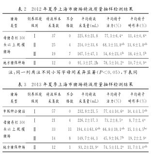 在我国南方,由夏季高温导致的种公猪热应激对精液的影响很大,直接影响母猪配种率和分娩成绩〔1〕。精液质量(活力和畸形率、密度等)反映种公猪饲养水平,而采取较好防暑降温措施对改善精液质量有明显作用。上海地区属亚热带海洋性季风气候,夏天炎热。据上海市徐家汇国家一般气象站观测资料,上海地区2012年高温天气(日最高气温≥35.0℃)共17d,而2013年夏季经历了往年罕见的47d高温天气。为摸清本市近2年种公猪精液质量,上海市动物疫病预防控制中心畜牧检测实验室对本市部分猪场种公猪开展了夏季精液监测,为提高母猪繁殖水平提供数据支持和理论依据。